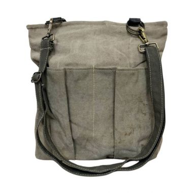 Our fully-lined recycled military tent bag features long backpack-style carrying straps, a top main zipper, 2 front exterior large open pockets and 1 interior zip pocket.